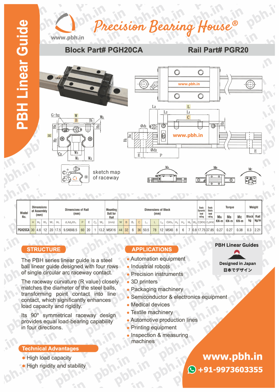 The PGH20CA is a square-type linear guide block designed for heavy-load applications requiring high precision and rigidity. As a core component of your linear motion system, it features a four-row ball design that ensures equal load ratings in all radial, reverse radial, and lateral directions. The self-aligning capability absorbs installation errors and provides smooth linear motion for a long service life.