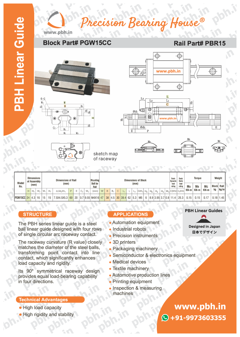 The PGW15CC is a Wide/Flange linear guide block designed for heavy-load applications requiring high precision and rigidity. As a core component of your linear motion system, it features a four-row ball design that ensures equal load ratings in all radial, reverse radial, and lateral directions. The self-aligning capability absorbs installation errors and provides smooth linear motion for a long service life.